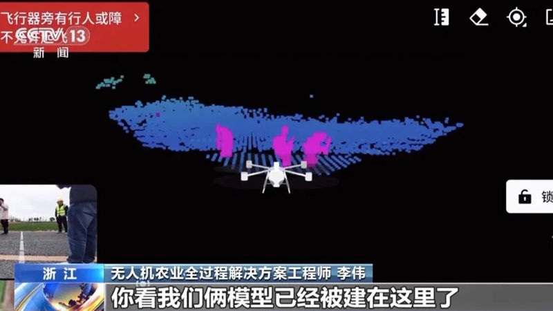 無人機(jī)農(nóng)業(yè)全過程解決方案工程師 李偉:說話的頃刻間,我們倆的模型已經(jīng)被建在這里了,后邊的農(nóng)田,模型已經(jīng)在這里建成了。